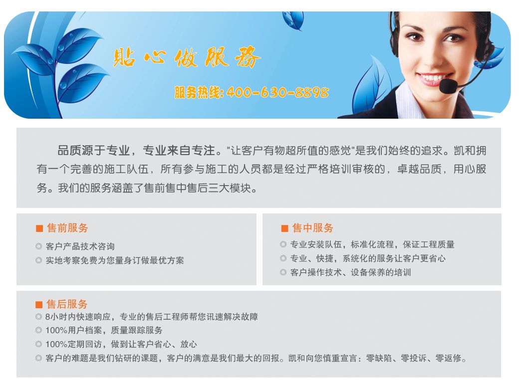 解決客戶難題:凱和擁有一個專業的施工團隊,多重安全防護措施,以“零缺陷、零投訴、零返修”的服務理念為客戶打造完美的中央熱水工程�!鞍诵r到位”“24小時全天候響應”特色售后服務機制讓客戶無后顧之憂。商用空氣能熱水機組,擁有超高的綜合能效,大大的降低用戶使用成本。