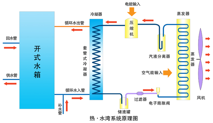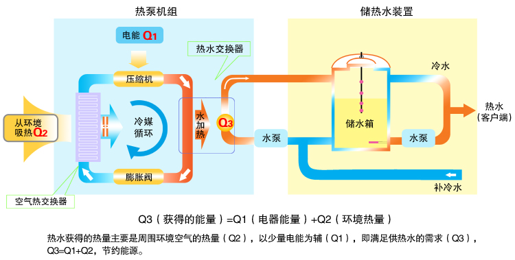 商用空氣能熱水器依據“逆卡諾”原理工作,以制冷劑為載體,將室外環境空氣的熱量,源源不斷的輸送到水側換熱器,再將熱量傳遞到水中,供給用戶以滿足生活熱水的需求。